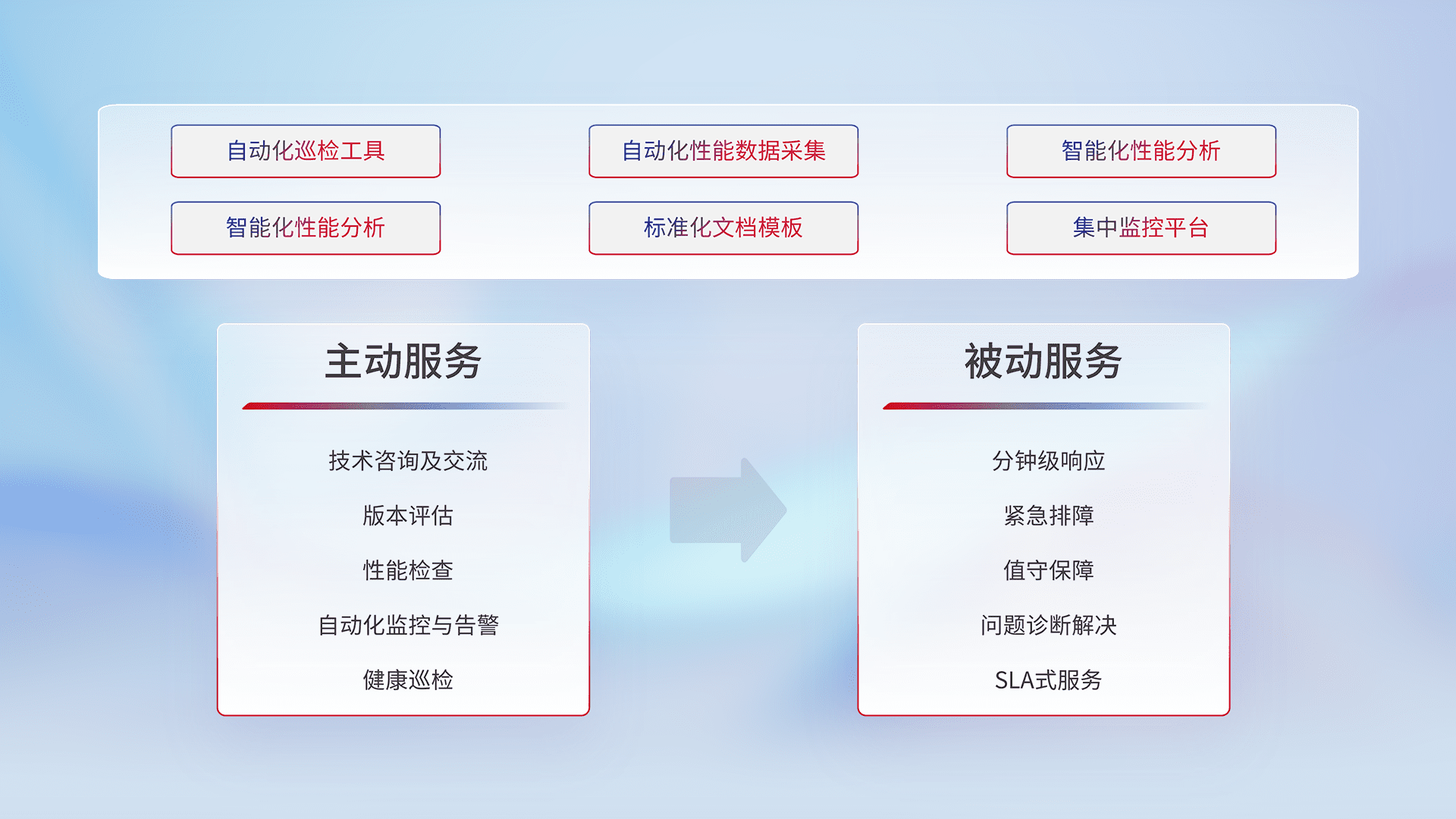 智能化工具和标准化文档,,保障服务质量,,,,提供主动服务(包含技术咨询、、版本评估、、、性能检查、、、、自动化监控与告警、、、、健康巡检)和被动服务包含(分钟级响应、、紧急排障、、、值守保障、、问题诊断解决、、、SLA服务)。。。。